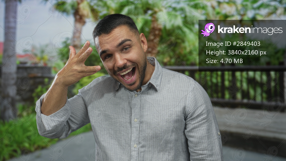 Man in striped shirt makes rock horns with hand under palm trees on wooden deck in forest; fun energy joy excitement.