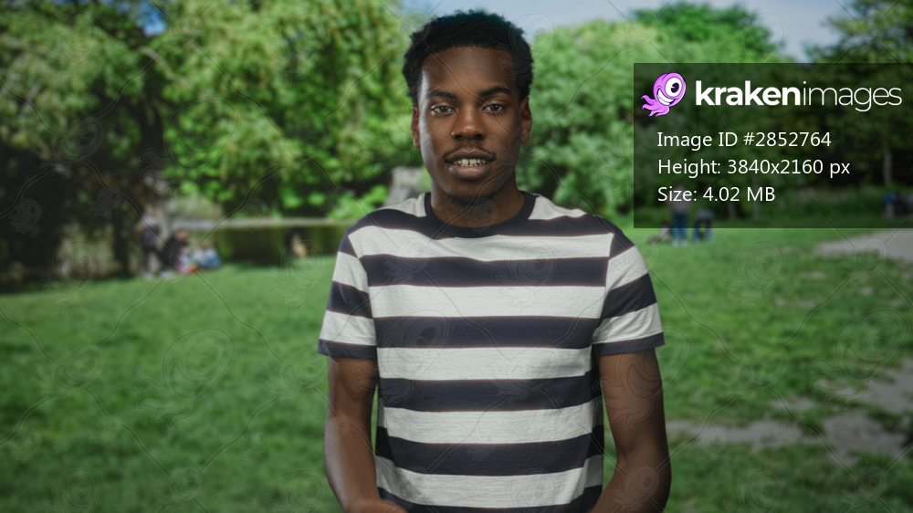 Man in striped shirt points finger with raised hand smiling in forest glade on green grass; confidence.