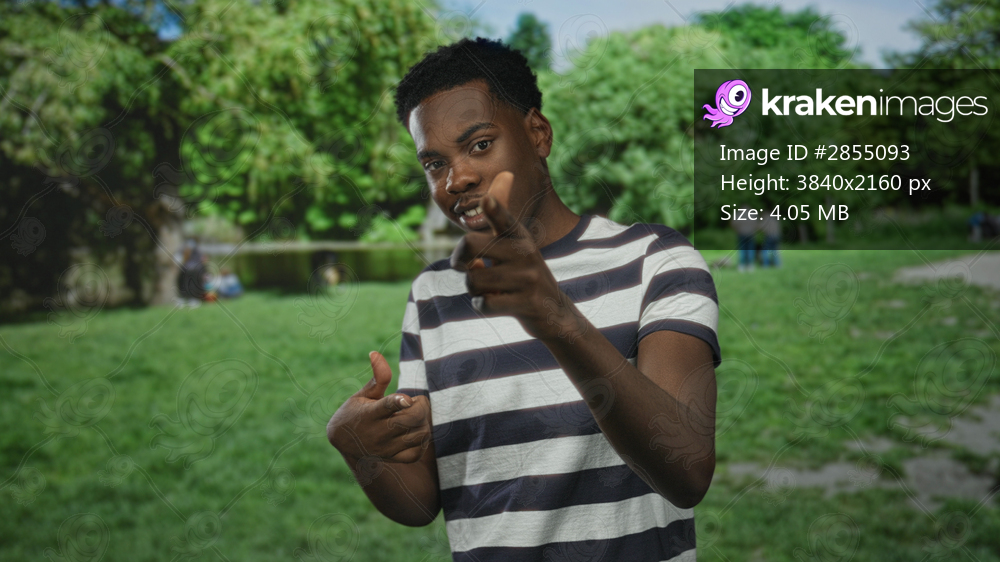 Man in striped shirt points finger with raised hand smiling in forest glade on green grass; confidence.