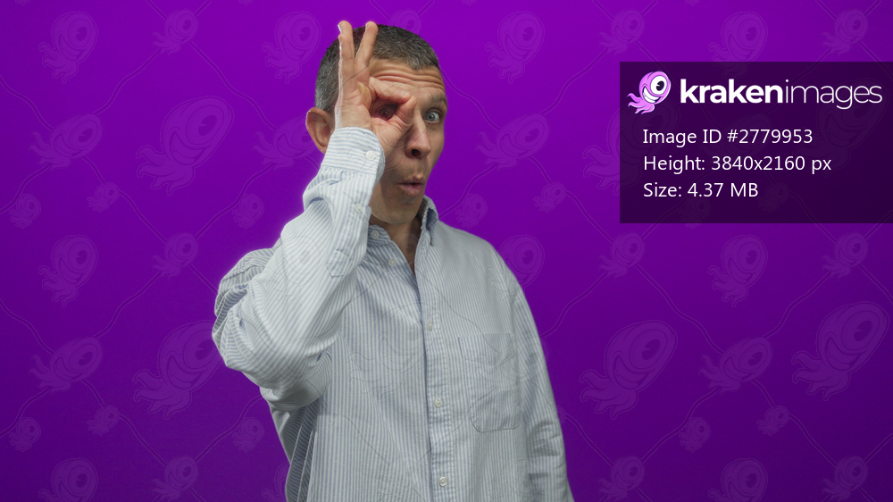 Man in striped shirt posing playfully with okay gesture against vibrant purple background, showcasing a confident and cheerful expression.