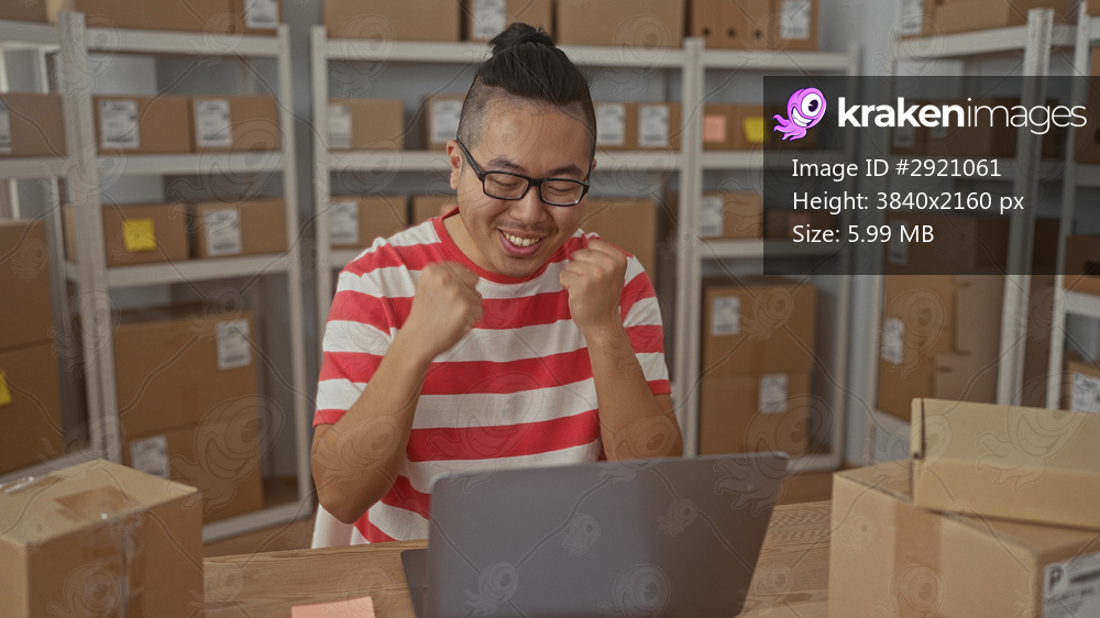 Man in striped shirt typing on laptop among parcel boxes with a fist pump gesture in storage building; small business success.