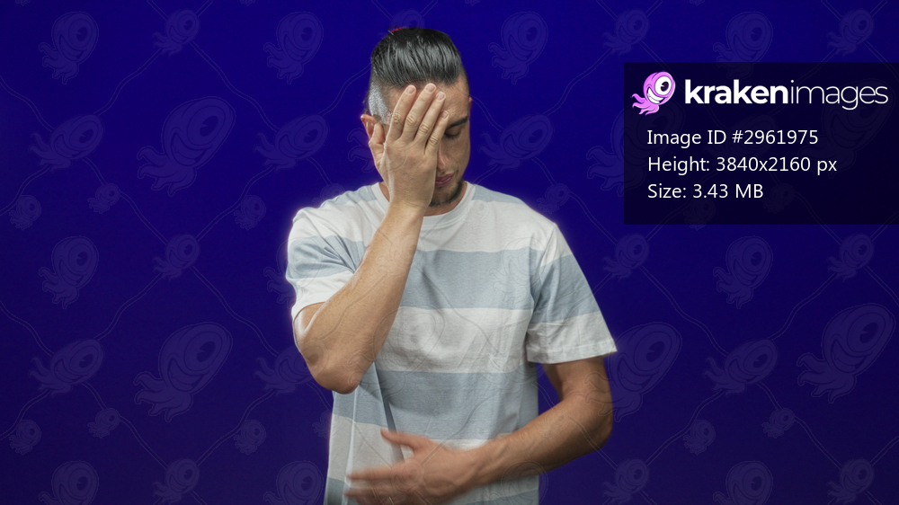 Man in striped t shirt covers face with hand, palm to forehead and eyes closed, standing against blue studio backdrop; frustration introspection.