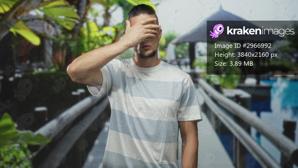 Man in striped tee covers eyes with his hand then raises and points index finger forward while standing on a wooden resort walkway beside pool building; introspection focus. - Kraken Images