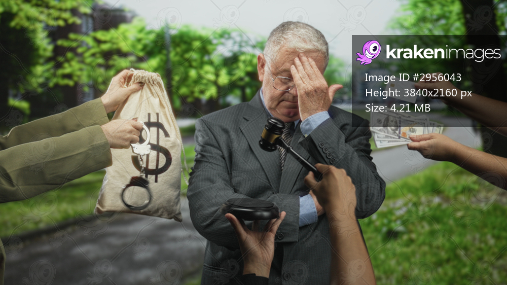 Man in suit with arms crossed as cash is offered and money bag with handcuffs held up on street; guilt corruption revelation.