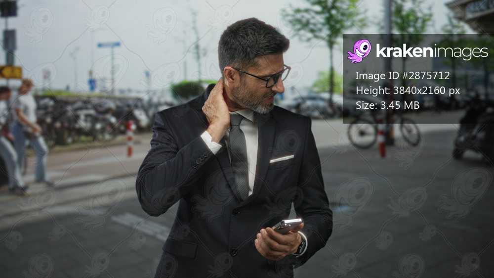 Man in suit businessman with hand on neck on city street holding smartphone for neck pain near parked bicycles and cars; stress deadline.