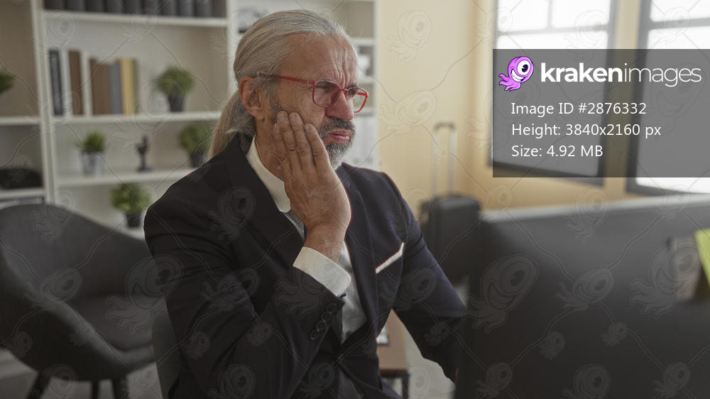 Man in suit with hand on cheek and toothache at office building desk computer, wearing red glasses and grey hair; work stress.