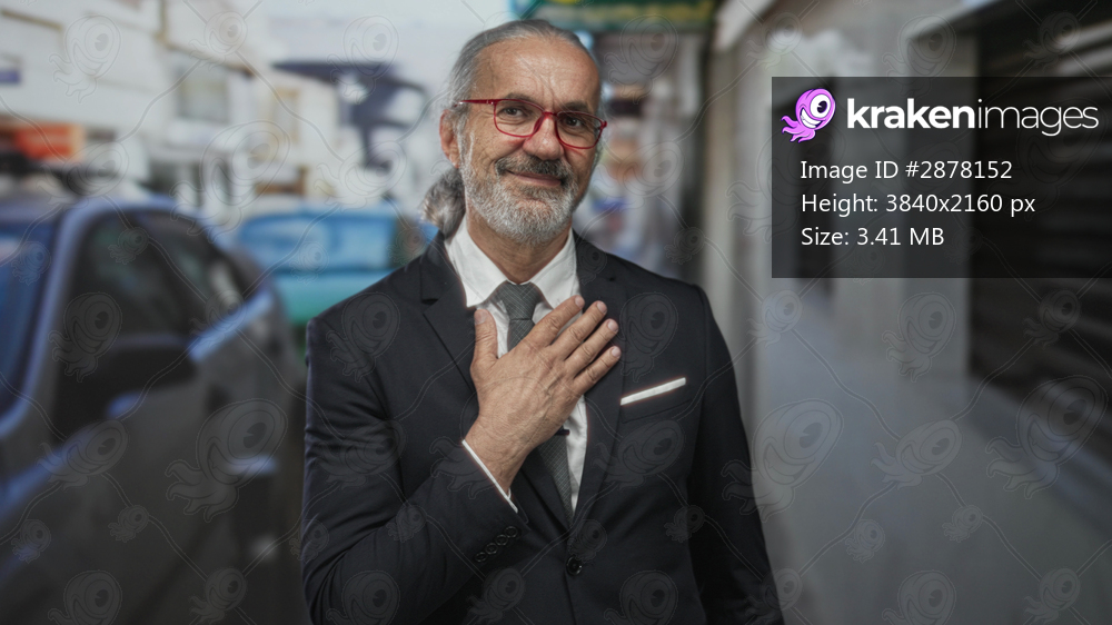 Man in suit with hand on chest on street, gray hair and beard, red glasses and pocket square; gratitude respect.