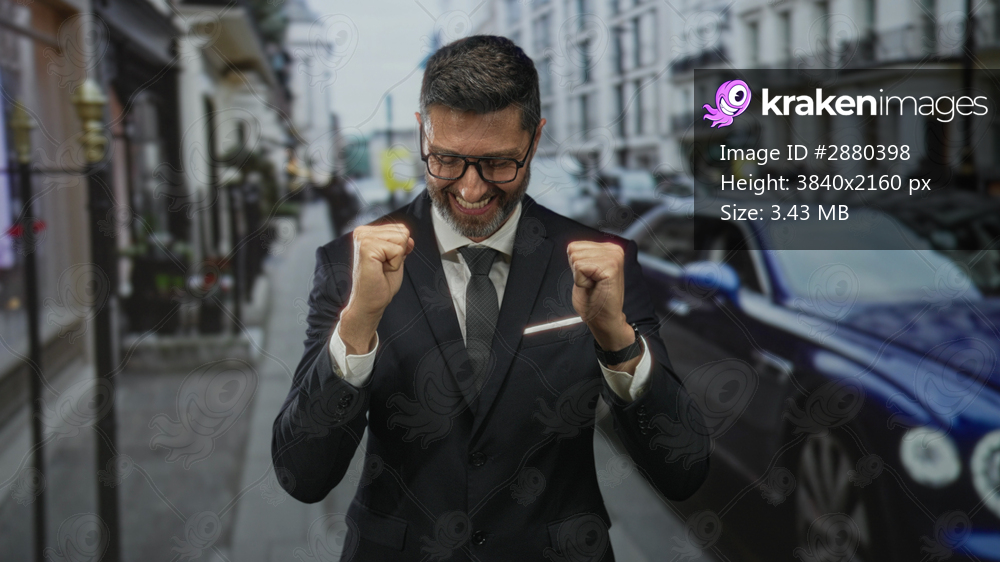 Man in suit with hands together in prayer on a street beside a parked luxury car, smiling and looking upward; joy success.