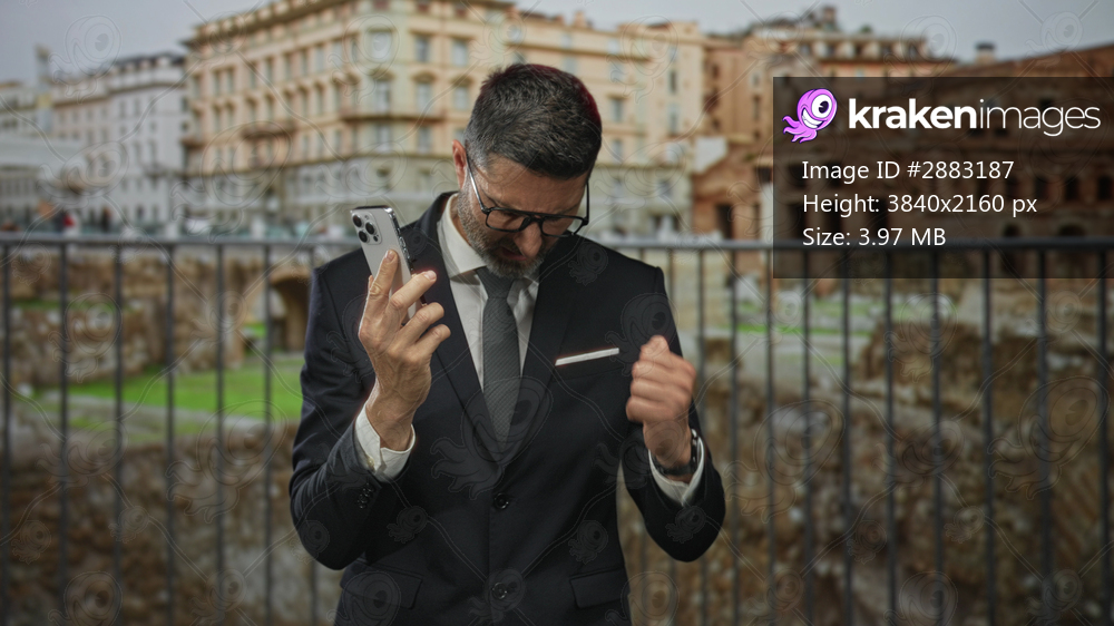 Man in suit holding smartphone up in hand by railing at ancient building ruins, eyes closed grimacing while listening to call; frustration travel.
