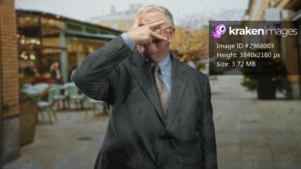 Man in suit makes a v shape with his fingers over his eye on a pedestrian street lined with shops and a holiday tree; mischievous.