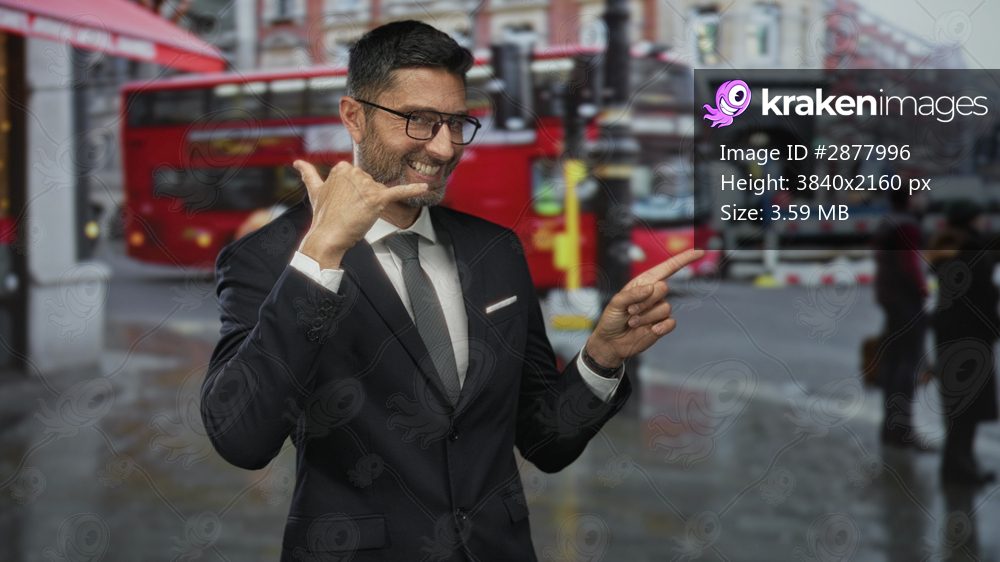 Man in suit makes phone hand gesture with left hand and points finger with right hand on rainy city street by red doubledecker bus; confidence success ambition. - Kraken Images
