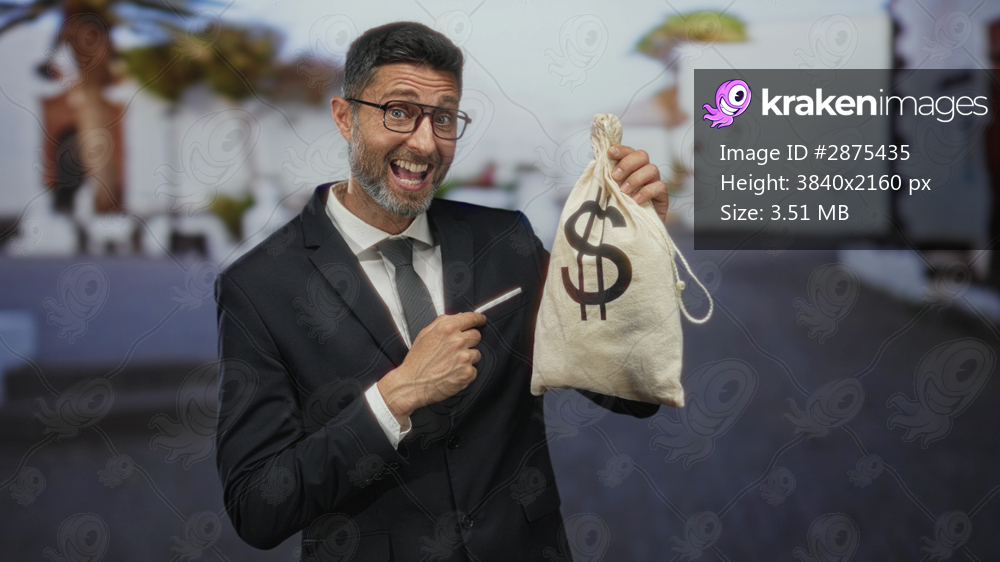 Man in suit pointing finger to money bag with dollar sign on a sunny street, smiling broadly; confidence success wealth.