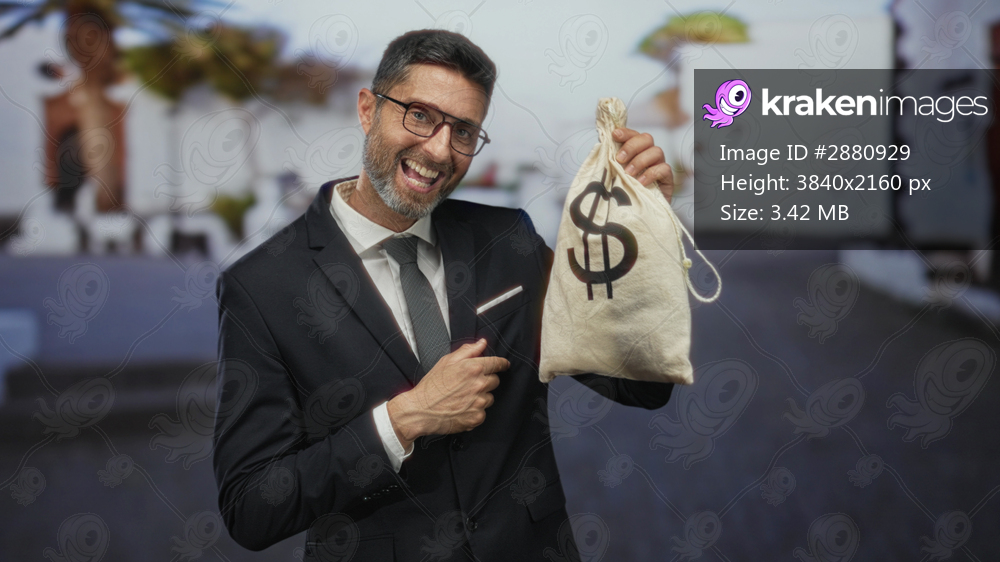 Man in suit pointing finger to money bag with dollar sign on a sunny street, smiling broadly; confidence success wealth.