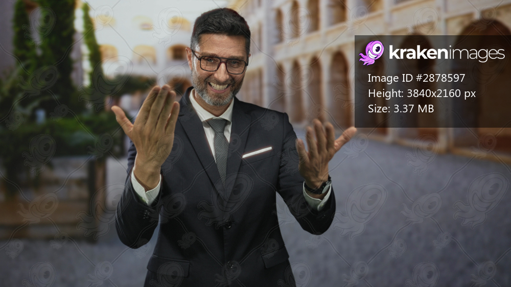 Man in suit points both fingers at camera in building courtyard with visible hands and expressive face, wearing glasses and tie; enthusiasm persuasion. - Kraken Images