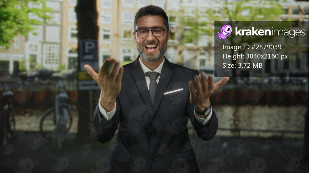 Man in suit points finger to camera showing hands on street by canal in amsterdam; confidence approachability success.