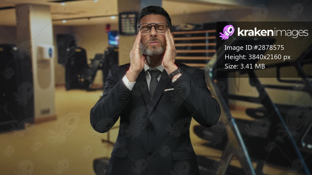 Man in suit presses his temples with both hands and winces beside a treadmill inside a building gym, wearing glasses and tie; stress exhaustion.