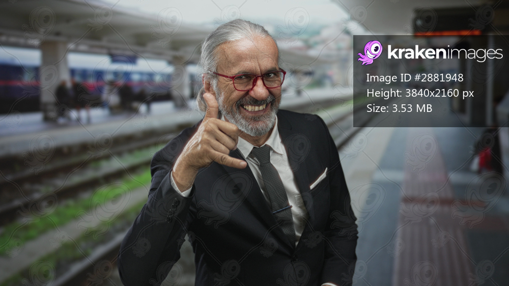 Man in suit with red glasses makes call me hand gesture at train station platform while smiling and holding tie; friendly greeting.