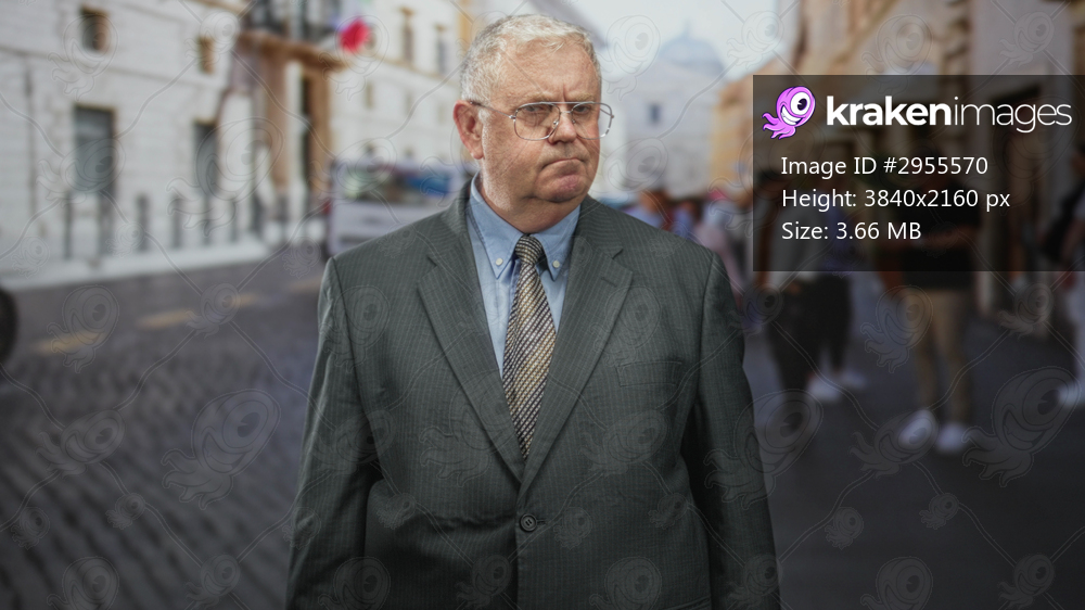 Man in suit with tie walking on cobbled street, mouth pursed and looking sideways; concerned reflection.