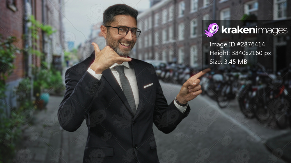 Man in suit wearing glasses smiling makes call gesture with hand and points finger on street; business confidence.