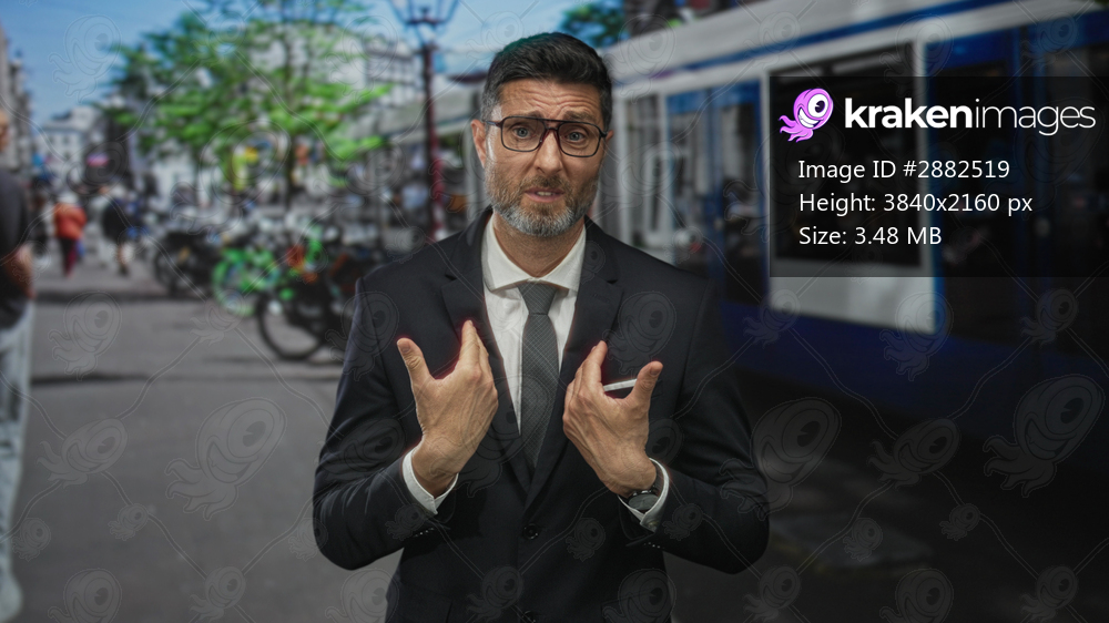 Man in suit wearing glasses and tie gesturing palms up on a busy city street near tram and parked bicycles, hands open and visible; business uncertainty. - Kraken Images