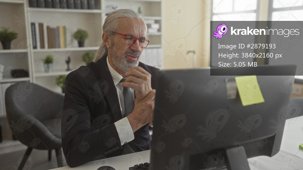 Man in suit wearing red glasses holding wrist at desk in building rubbing hand for pain; stress concentration.