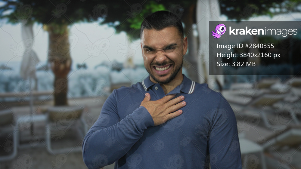 Man in sunlit blue shirt clutching chest with grimace at resort pool deck; pain anxiety heartattack.