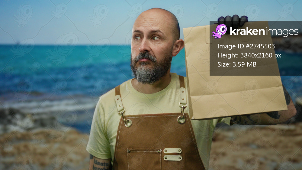 Man in tan overalls with a beard holds a paper bag at a seaside location, gazing thoughtfully with a stunning sea view in the background.