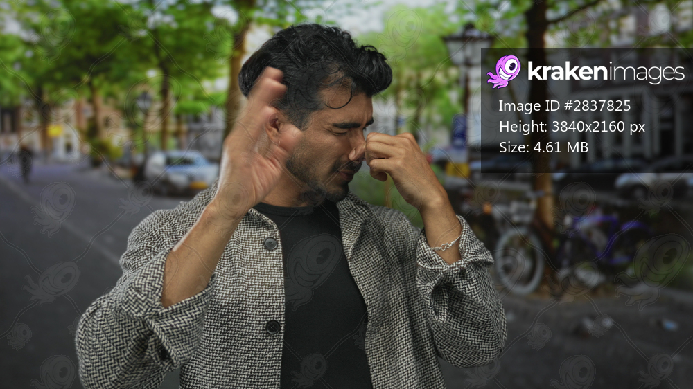 Man in tweed shirt pinches nose while standing on street lined with parked bicycles and leafy trees; disgust.