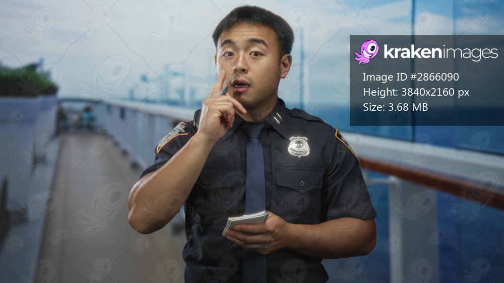 Man in uniform writes in notepad with pen while holding finger to lips for silence on street; order duty silence calm.