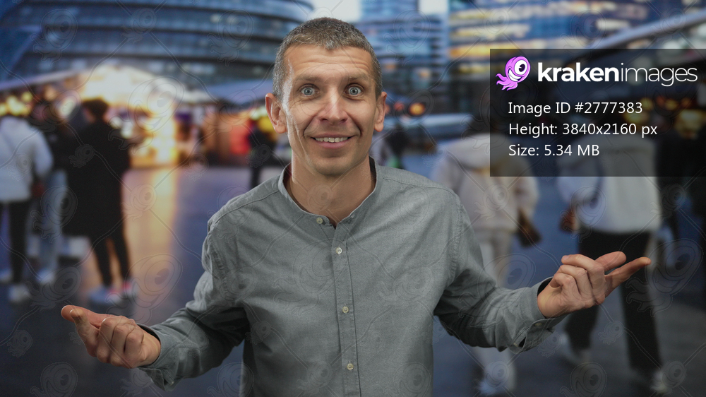 Man in urban street setting pointing at himself with a surprised expression, surrounded by blurred pedestrians and illuminated shops creating a lively city atmosphere. - Kraken Images