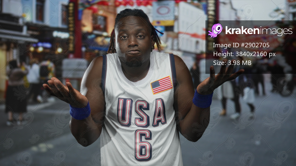 Man in usa basketball jersey shrugging on a busy city street with arms visible, palms up and sweatbands showing; uncertainty patriotism.