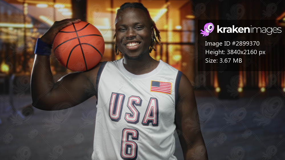 Man in usa basketball jersey smiles holding basketball on shoulder inside building; confidence teamwork.