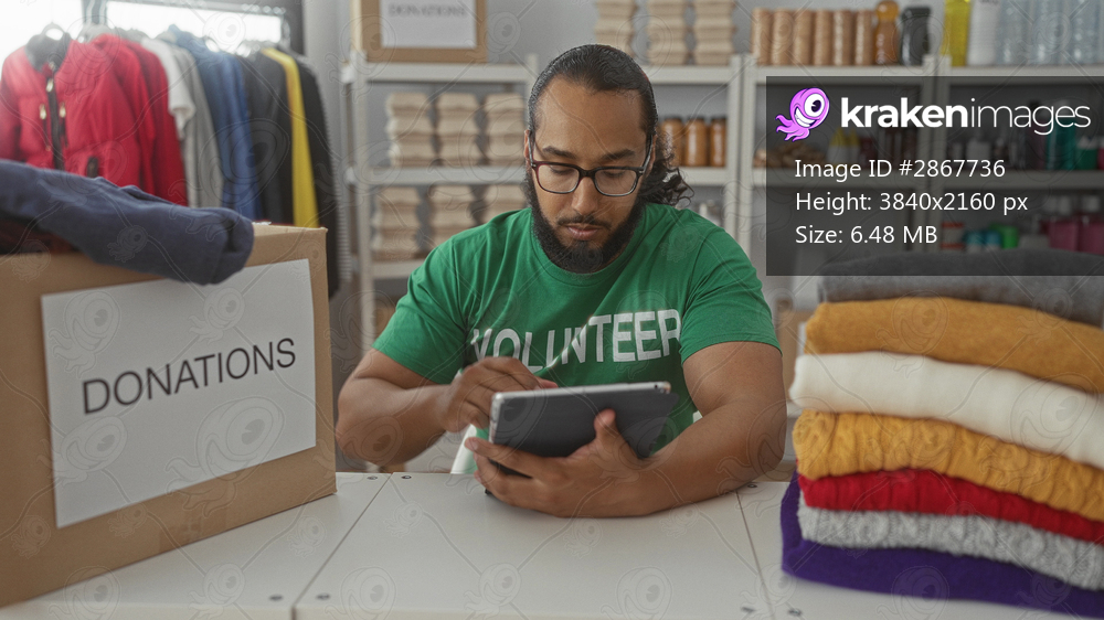 Man in volunteer shirt taps tablet with finger beside a donations box in building storage room; community service compassion.