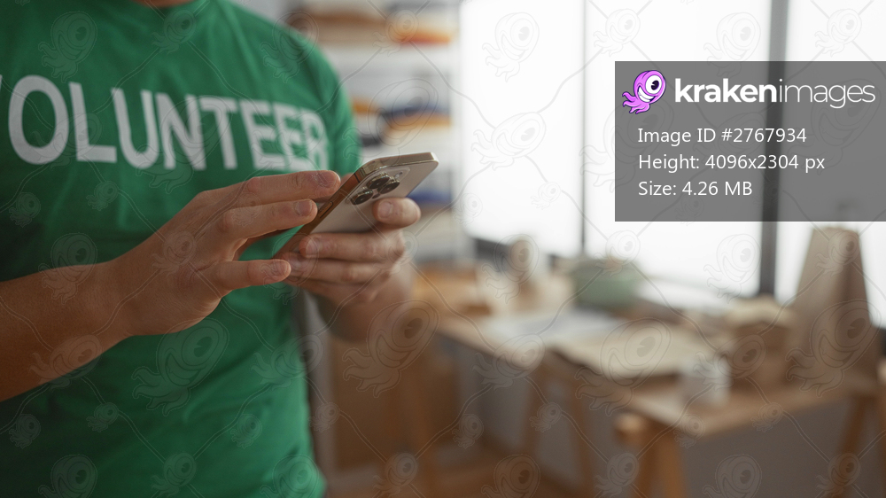 Man in volunteer shirt using smartphone in a charity center, highlighting the dynamic interaction of technology and community service enhancing donations. - Kraken Images