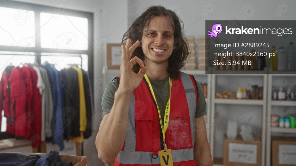 Man in volunteer vest makes ok sign inside a building near supplies and clothing racks; community support.
