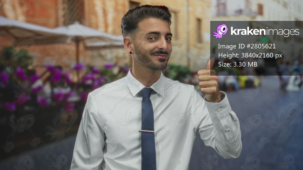 Man in white buttondown shirt and tie smiling and gives thumbs up at outdoor restaurant terrace; optimism.