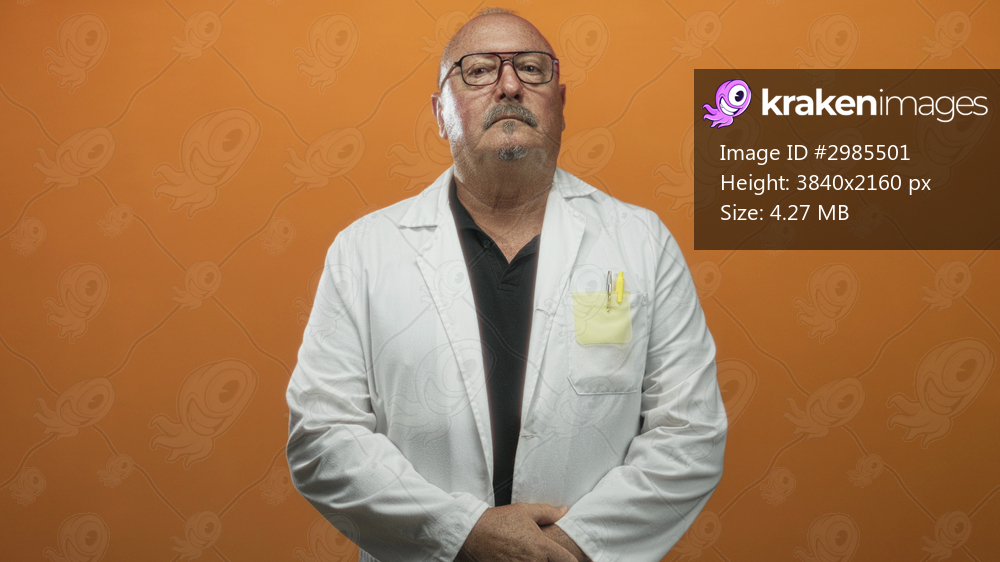 Man in white coat buttoning coat with hands visible, pen in pocket and glasses on face against orange studio backdrop; serious professionalism.
