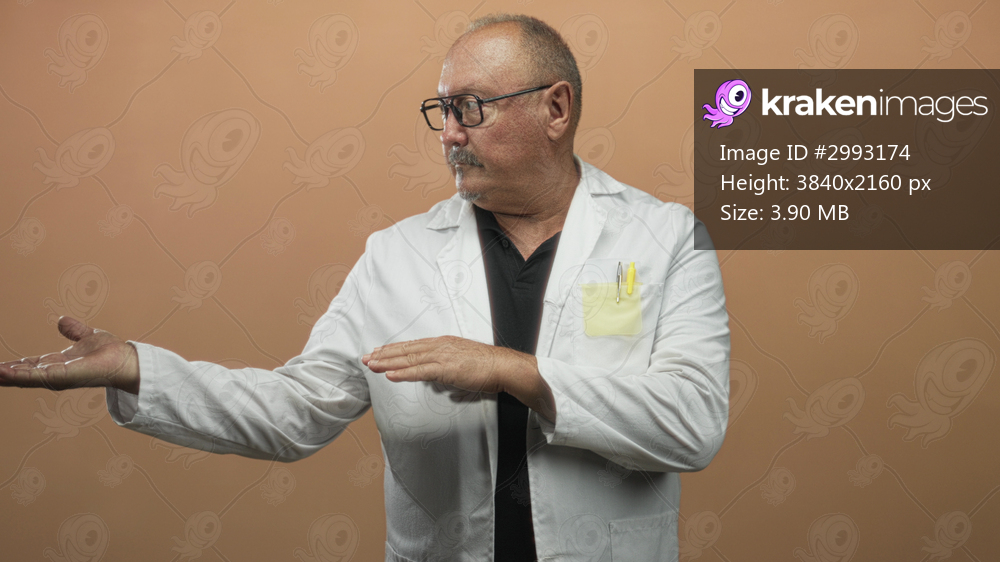 Man in white coat and glasses presents palm facing camera with left hand extended and right hand horizontal in studio; confidence reassurance guidance. - Kraken Images