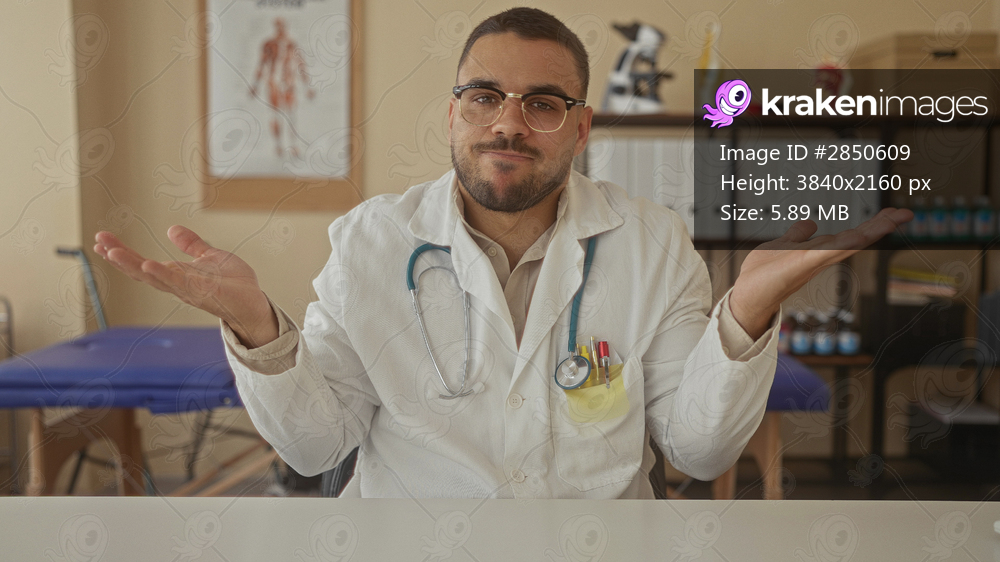 Man in white coat holding stethoscope shrugs with palms up beside examination table and medical kit in building; confusion.