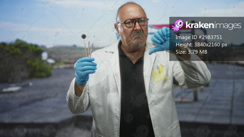 Man in white coat holds dental mirror with blue gloves and makes thumbs down gesture at a building rooftop; doubt concern.