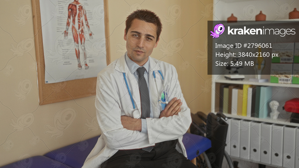 Man in white coat with stethoscope sits with arms crossed in modern clinic room with neutral expression looking at camera; rejection.