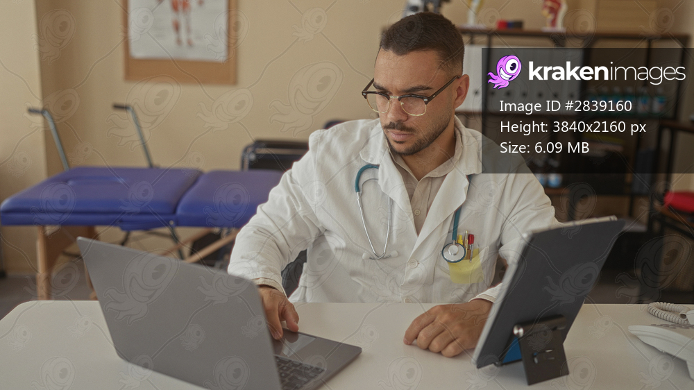 Man in white coat and stethoscope taps tablet and checks laptop in clinic building; professional focus.