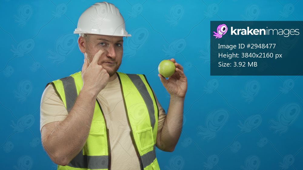 Man in white hardhat and hi vis vest points finger to cheek while holding green apple in blue studio; thoughtful.
