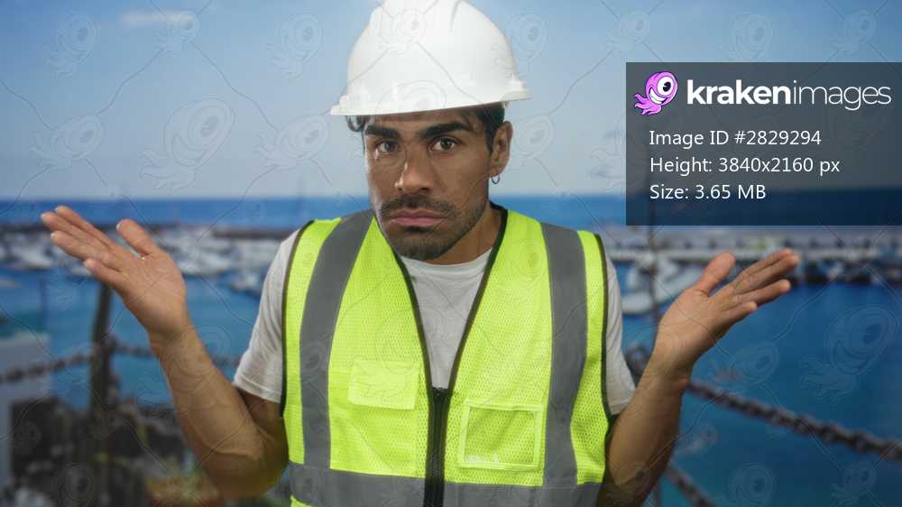 Man in white hardhat and reflective vest holds hands forward at sunlit port dock with moored boats; caution.