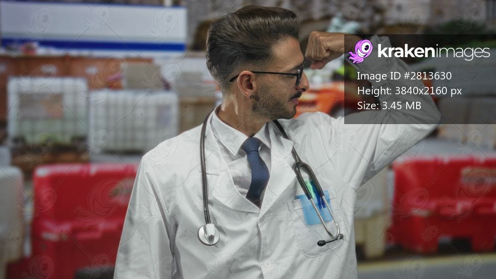 Man in white lab coat and navy tie flexes right arm while wearing stethoscope in front of building with forklift and red barrier outdoors; confidence.