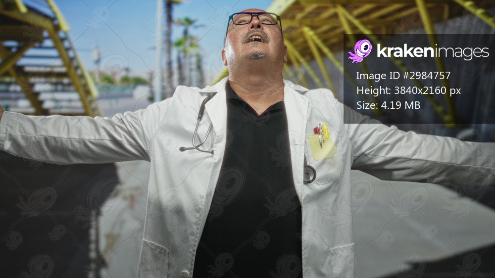 Man in white lab coat with stethoscope and pens in pocket, arms outstretched on street boardwalk by yellow stairs; relief healing.