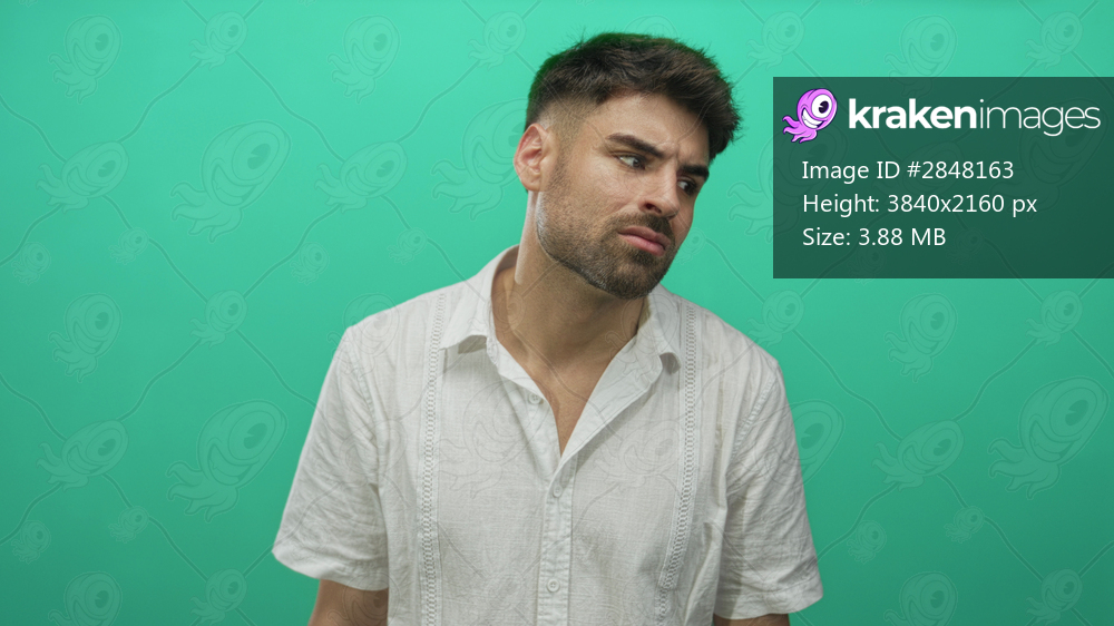 Man in white linen shirt scowls with furrowed brow and tightened jaw in bright green studio set; annoyance.