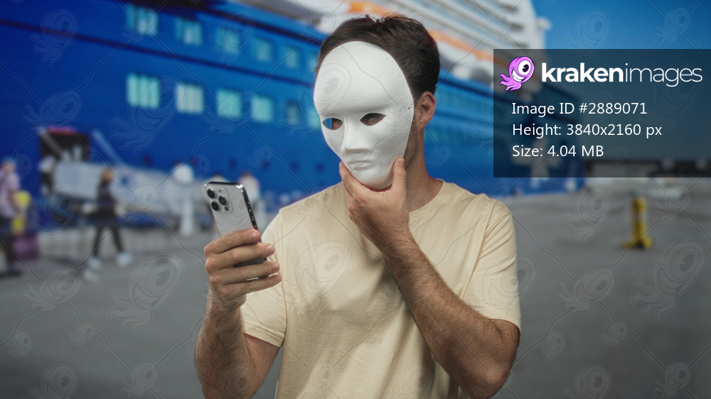 Man in white mask holds smartphone and touches chin at port near a moored cruise ship; identity uncertainty.