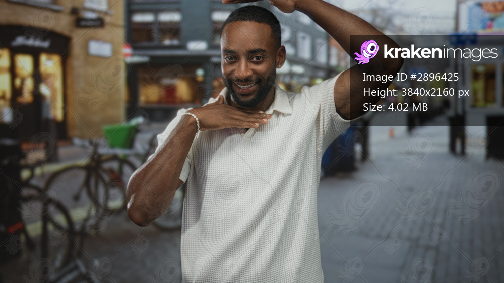 Man in white polo with bracelet hands framing chin smiling toward camera on street with bicycles and storefronts; casual confidence.