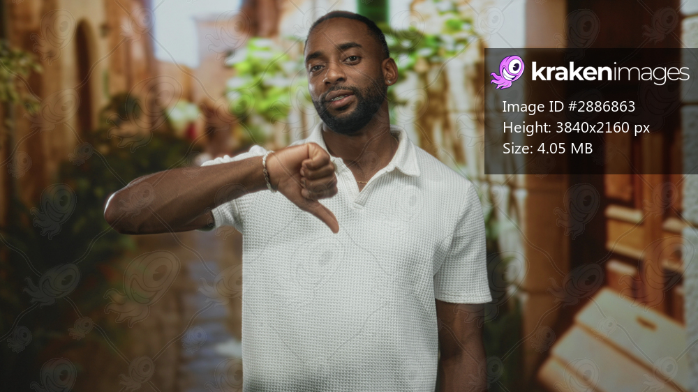 Man in white polo giving thumbs down with bare right hand on old town street lined with stone buildings; disapproval.